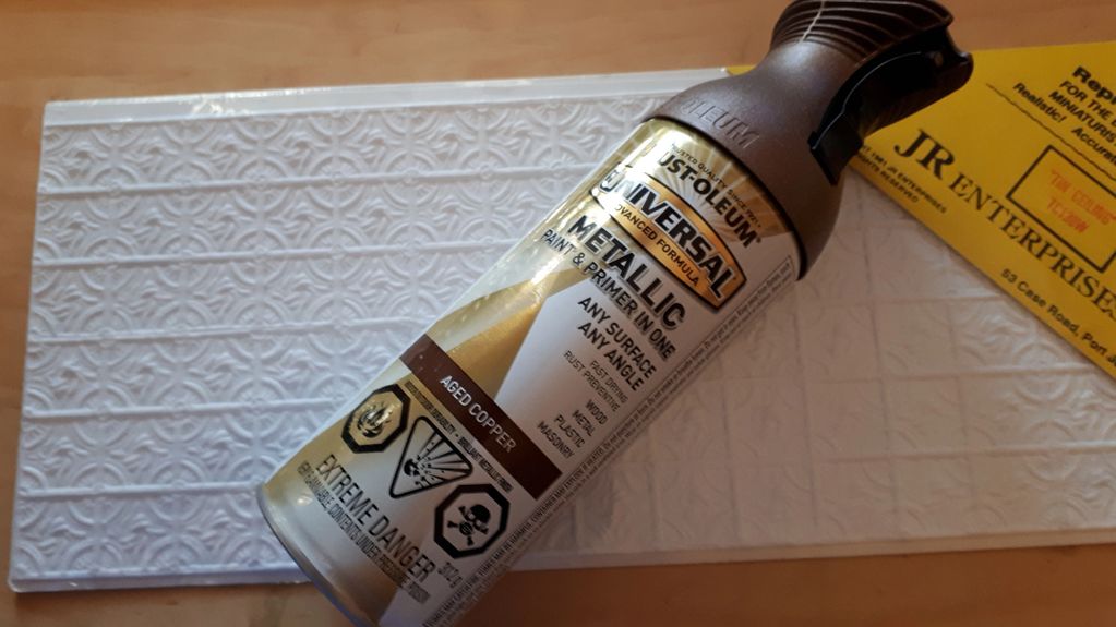 Plastic ceiling sheets for dollhouses and Rust-Oleum spray paint for any surface.
